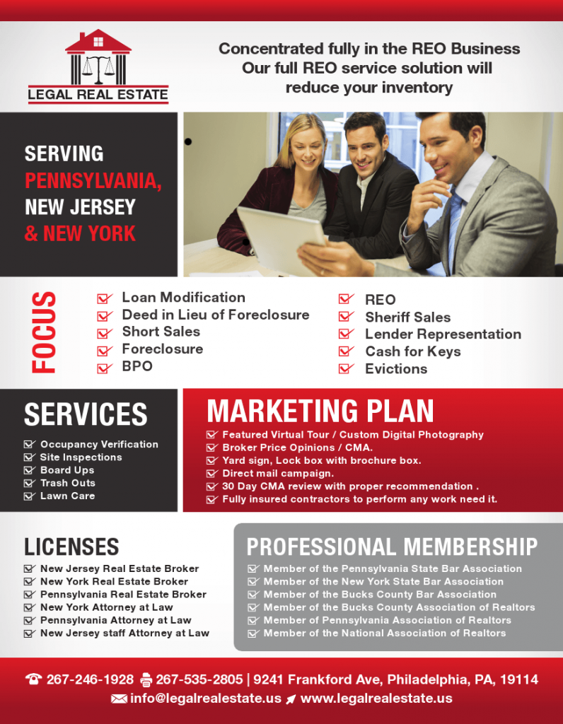 Legal Real Estate LLC is a company focus on residential, commercial and industrial real estate, our headquarters is located on 9200 Academy Rd, Philadelphia, PA, 19114, besides servicing Pennsylvania we provide real estate services in New Jersey and New York.