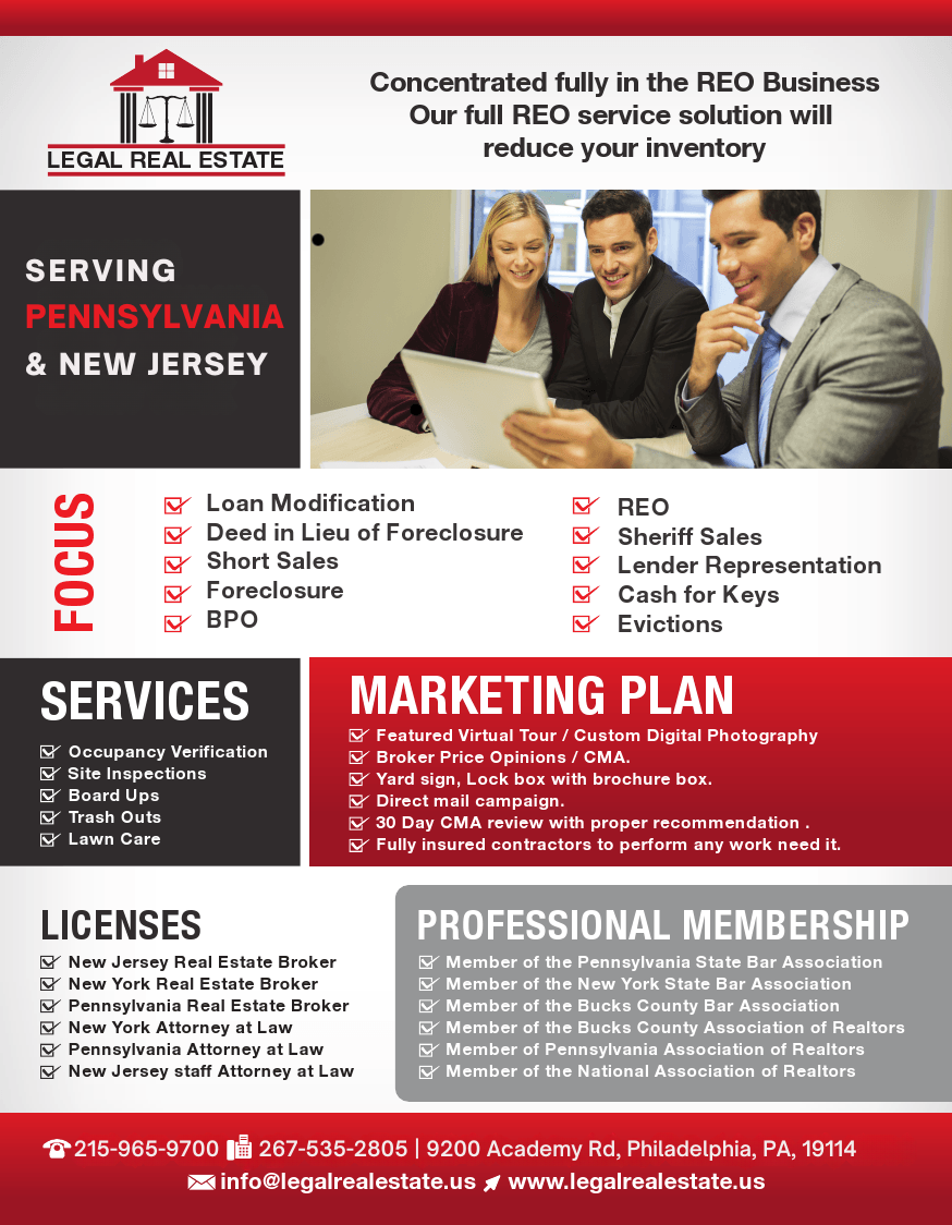 Legal Real Estate LLC is a company focus on residential, commercial and industrial real estate, our headquarters is located on 9200 Academy Rd, Philadelphia, PA, 19114, besides servicing Pennsylvania we provide real estate services in New Jersey and New York.
